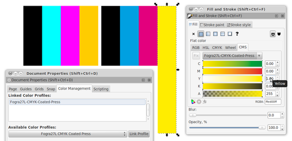 Zatim pokrenite Inkscape i plutajuću paletu Document Properites, File > Document properties (Shift+Ctrl+D), pa pređite u karticu Color Managment. Sada preko padajućeg menija Avilable color profiles link-ujte kolor profil tj. ICC profil (u mom slučaju je to Fogra 27LCMYK Coated Pres). Zatim izaberite obojeni objekati i u plutajućoj paleti Fill and Stroke (Shift+Ctrl+F) izaberite kartcu CMS. Nakon toga u padajućem meniu Fix izaberite Vaš ICC profil, pa zatim korigujte procente boje. Ovako korigovane boje prilikom konvrzije u CMYK ostati gotovo nepromenjene.